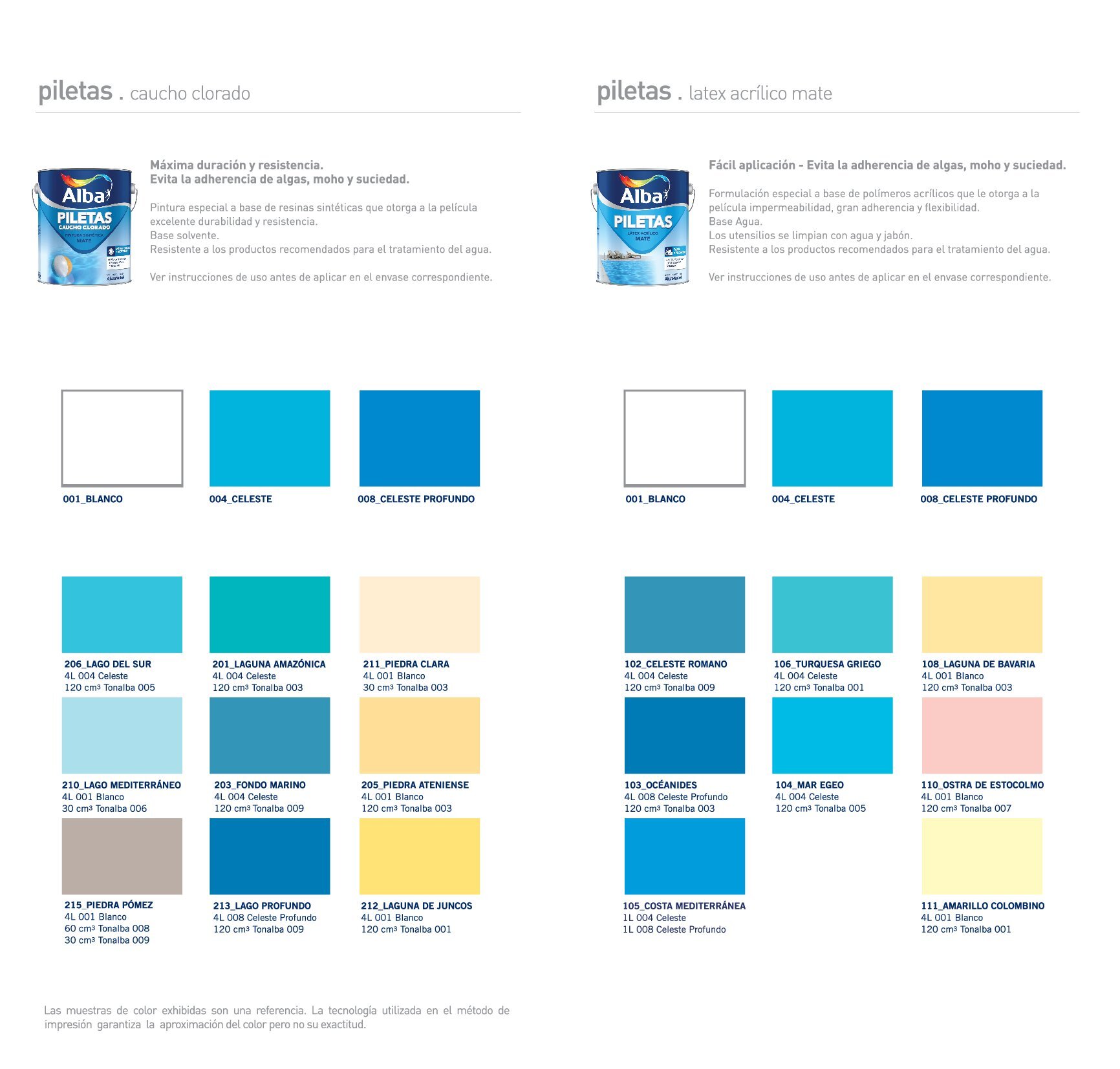 • Látex para Piletas de Natación Mate. Formulación especial a base de polímeros acrílicos que le otorga a la película impermeabilidad, gran adherencia y flexibilidad. Evita la adherencia de algas, hongos, moho y suciedad. Resistente a los productos recomendados para el tratamiento del agua. Blanco y 2 colores listos para usar. Entonable con Tonalba hasta 30 cm3/litr